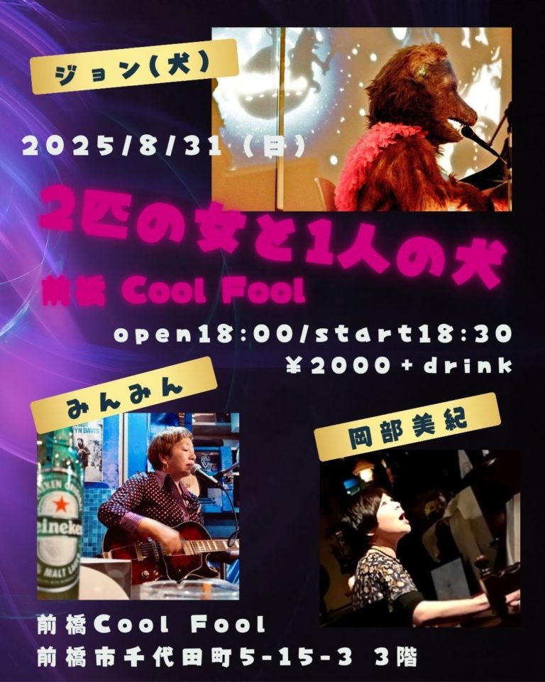ジョン(犬)◆8/31@前橋COOLFOOL 2025/2/5 ブログ ★8/31(日) 『2匹の女と1人の犬』前橋 COOLFOOL前橋市千代田町5-15-3 3階open18:00/start18:30 ¥2000(+1drink)出演:岡部美紀みんみんジョン(犬) 共有:クリックして Twitter で共有 (新しいウィンドウで開きます)Facebook で共有するにはクリックしてください (新しいウィンドウで開きます)